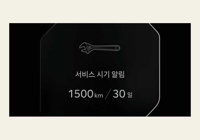 잔여 주행 거리 1,500 km 또는 잔여 기간 30일 시점부터는 시동을 켤 때마다 서비스 알림 정보가 LCD 표시창에 자동으로 수 초 동안 표시됩니다.