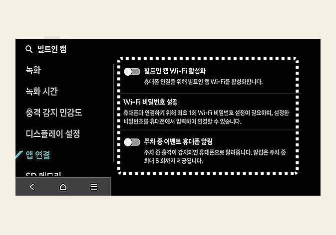 휴대폰 앱 연결을 위한 Wi-Fi를 활성화하거나, Wi-Fi 비밀번호를 설정할 수 있습니다.