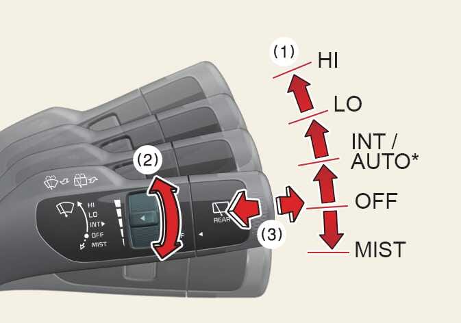 와이퍼 조절 OSV034049 와이퍼 속도 조절 MIST: 와이퍼 1회 작동 OFF: 작동 정지 INT/ AUTO*: 간헐적 작동/자동 조절* LO: 저속 작동 HI: 고속 작동 와이퍼 간헐적 작동/자동 조절 속도 기준 변경 앞유리/뒷유리 워셔액 분출 및 와이퍼 일시 작동 사양 적용 시 작동 조건 DRIVE READY 상태인 경우