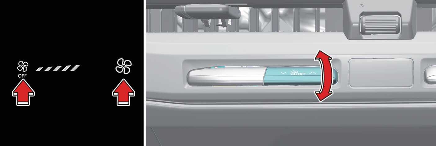 풍량 조절 버튼을 누르거나 혹은 풍량 조절 레버를 위 아래로 눌러 풍량을 조절하십시오.