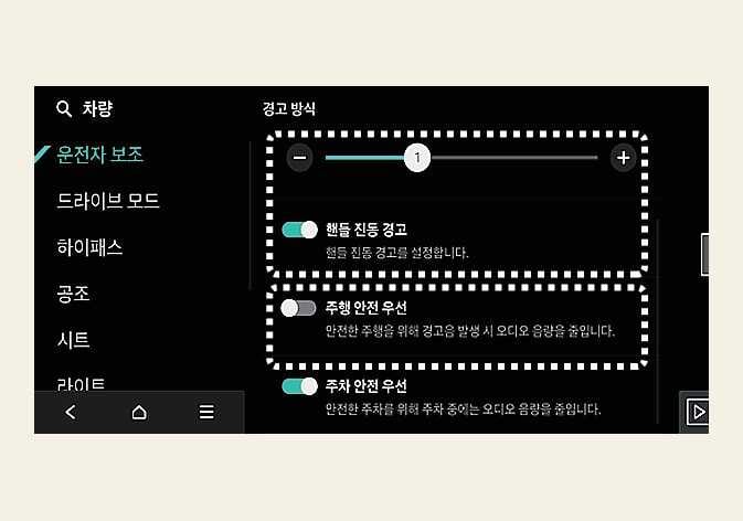 경고 방식은 DRIVE READY 상태에서, 인포테인먼트 시스템의 설정 > 차량 > 운전자 보조를 차례로 선택하십시오. (경고 방식)을 설정할 수 있습니다.