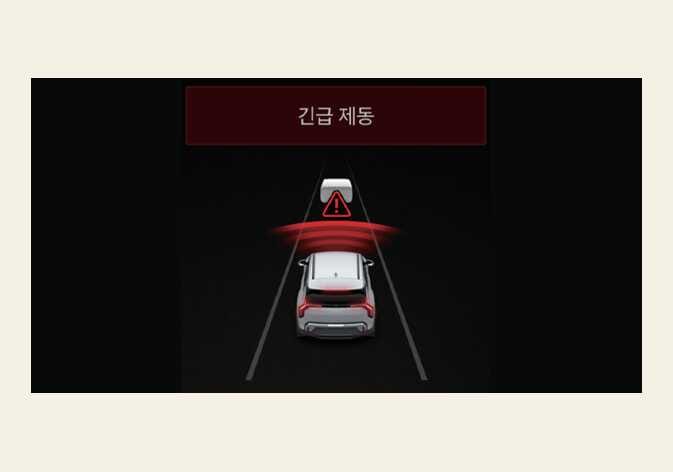 긴급 제동으로 정차 시 클러스터 등에 경고문이 표시됩니다. 안전을 위해 즉시 브레이크 페달을 밟고, 주변 상황을 확인하십시오.