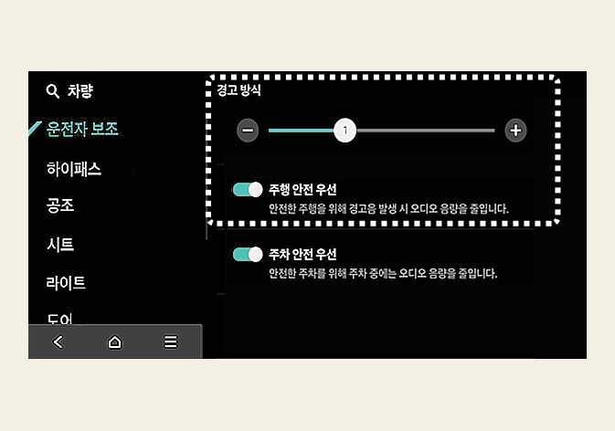 경고 방식을 변경하면 다른 운전자 보조 시스템의 경고 방식도 같이 변경될 수 있습니다. 고려하여 변경하십시오.