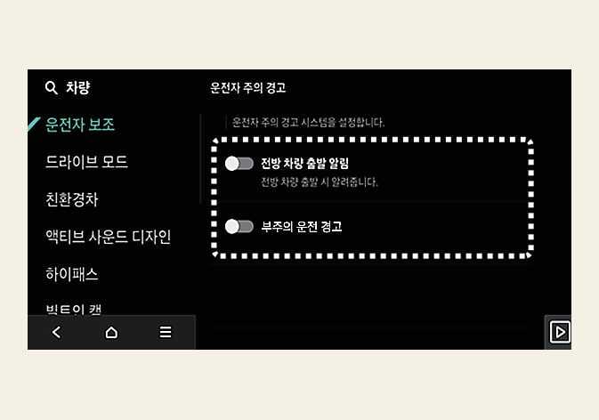 DRIVE READY 상태에서 인포테인먼트 시스템의 를 차례로 선택하십시오. 각 기능의 사용 여부를 설정할 수 있습니다.