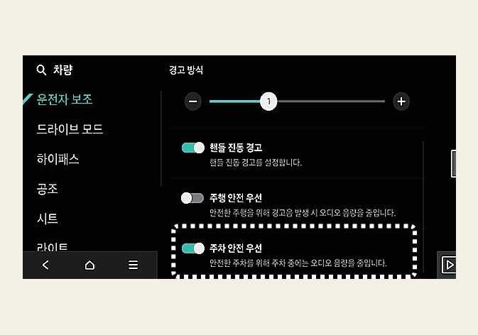 경고 방식은 DRIVE READY 상태에서, 인포테인먼트 시스템의 설정 > 차량 > 운전자 보조를 차례로 선택하십시오. (경고 방식)을 설정할 수 있습니다.