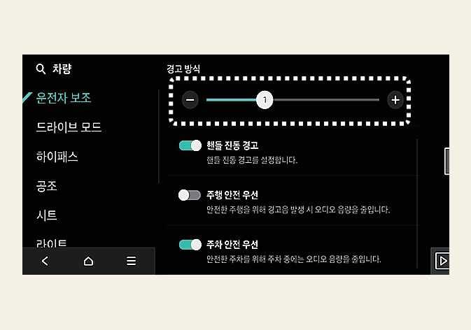 경고 방식을 변경하면 다른 운전자 보조 시스템의 경고 방식도 같이 변경될 수 있습니다. 고려하여 변경하십시오.