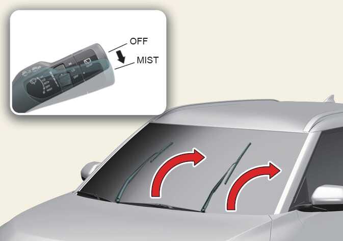 약 20초 이내에 와이퍼가 최상단으로 올라갈 때까지 와이퍼 스위치를 약 2초 이상 MIST 위치로 조작하십시오.