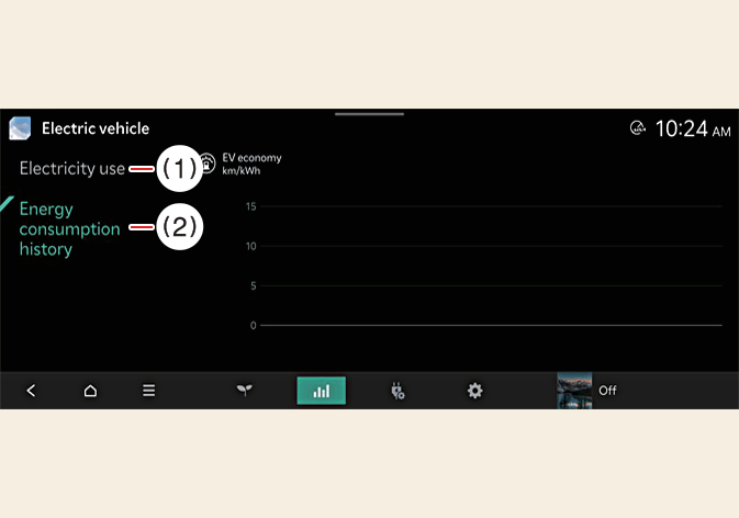 Es ist möglich, den Verlauf des Energieverbrauchs mit dem Datum und der Entfernung der letzten Fahrt zu überprüfen. Das Symbol wird bei der effizientesten Energiesparaufzeichnung angezeigt.