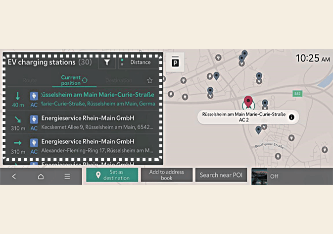 Es wird im Bereich der Strecke, der aktuellen Standorts, des ausgewählten Ziels oder der empfohlenen Ladestationen gesucht. Wenn Sie eine Ladestation auswählen, werden Detailinformationen dazu bereitgestellt. |