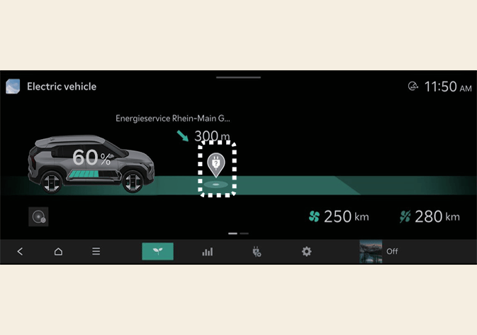 Wählen Sie das Symbol und sehen Sie die Karte auf dem Bildschirm des Infotainment-Systems. Es wird nach Ladestationen in der Umgebung des aktuellen Standorts gesucht. |