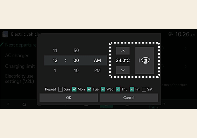 Wenn die Zieltemperatur bei angeschlossenem Kabel eingestellt ist, wird die Kabinentemperatur auf die Zieltemperatur zur Abfahrtszeit eingestellt (ohne Ladungsverlust der Hochspannungsbatterie). Bei kalter Witterung trägt die Vorheizung dazu bei, die Leistung von Elektrofahrzeugen zu verbessern, indem das Fahrzeug im Voraus geheizt wird.