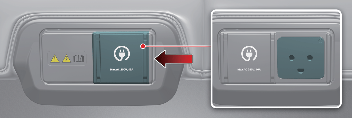 Schließen Sie das Fahrzeug an die V2L-Steckdose an, die sich unter dem Rücksitz befindet, und stellen Sie die EV-Taste in Position POWER ON oder DRIVE READY.
