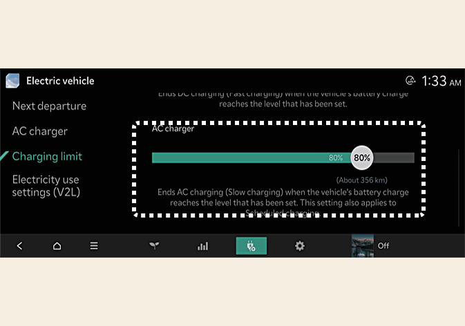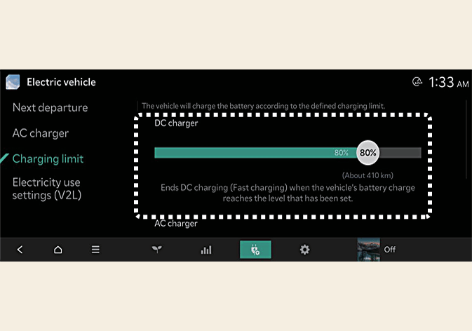 • Der Ladezustand der Batterie kann beim Laden mit einem Wechselstrom-Ladegerät oder Gleichstromladegerät ausgewählt werden.