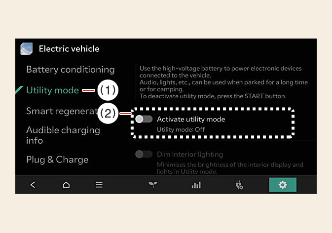 Die Hochspannungsbatterie wird statt der 12-V-Hilfsbatterie für den Betrieb der Komfortfunktionen des Fahrzeuges verwendet. Wenn keine Energie für die Fahrt selbst benötigt wird, beispielsweise beim Camping oder bei einem längeren Stopp des Fahrzeugs, können Sie die Elektrogeräte (Audioanlage, Beleuchtung usw.) viele Stunden nutzen.