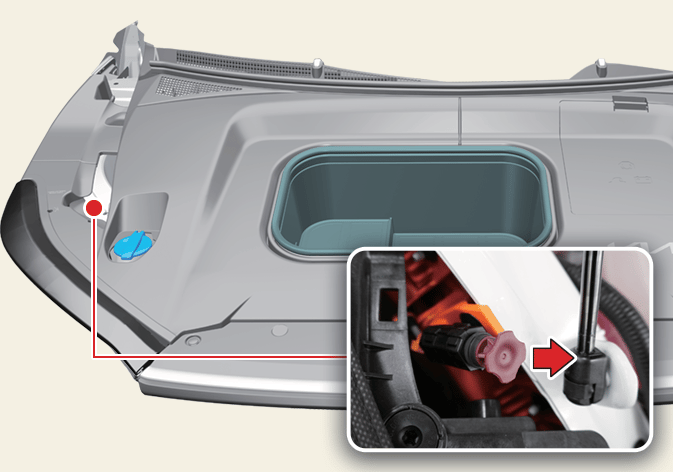 Wenn sich das Ladekabel wegen Entladung der Batterie oder defekter Kabel nicht löst, öffnen Sie die Haube und ziehen Sie leicht am Notstromkabel auf der linken Seite des vorderen Kofferraums, wie in der Abbildung gezeigt. Der Ladestecker wird dann entriegelt.