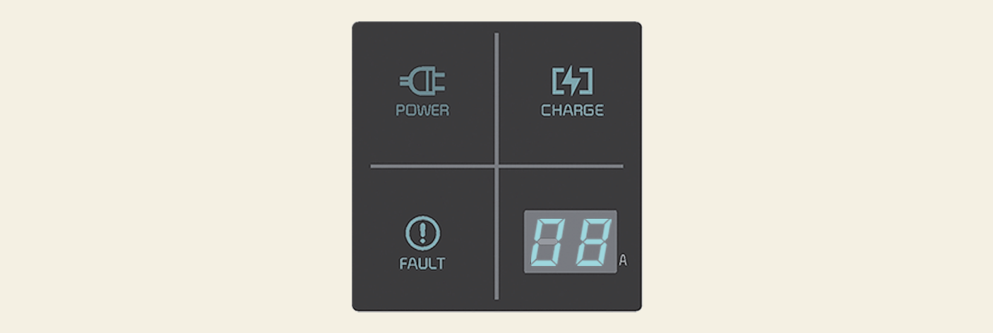 Der Ladestrom ändert sich, wenn Sie die Taste (1) für weniger als 1 Sekunde drücken und das Ladegerät mit einer Steckdose verbunden ist, aber nicht mit dem Fahrzeug.