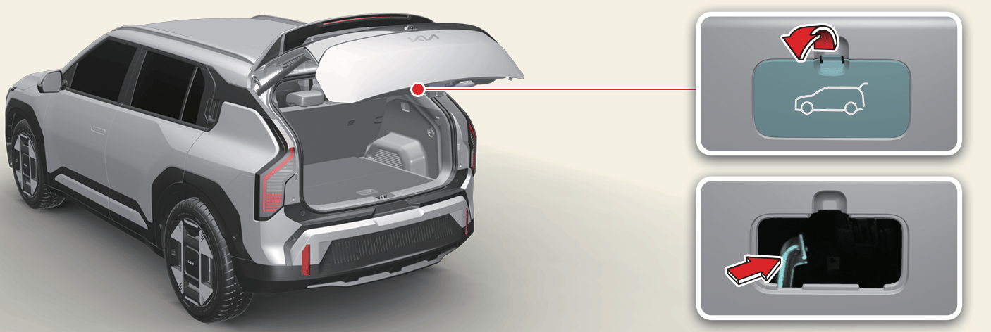 Merken Sie sich für den Notfall, wo sich der Notentriegelungshebel der Heckklappe befindet und wie er bedient wird, damit Sie sich befreien können, wenn Sie versehentlich im Kofferraum eingeschlossen sind.