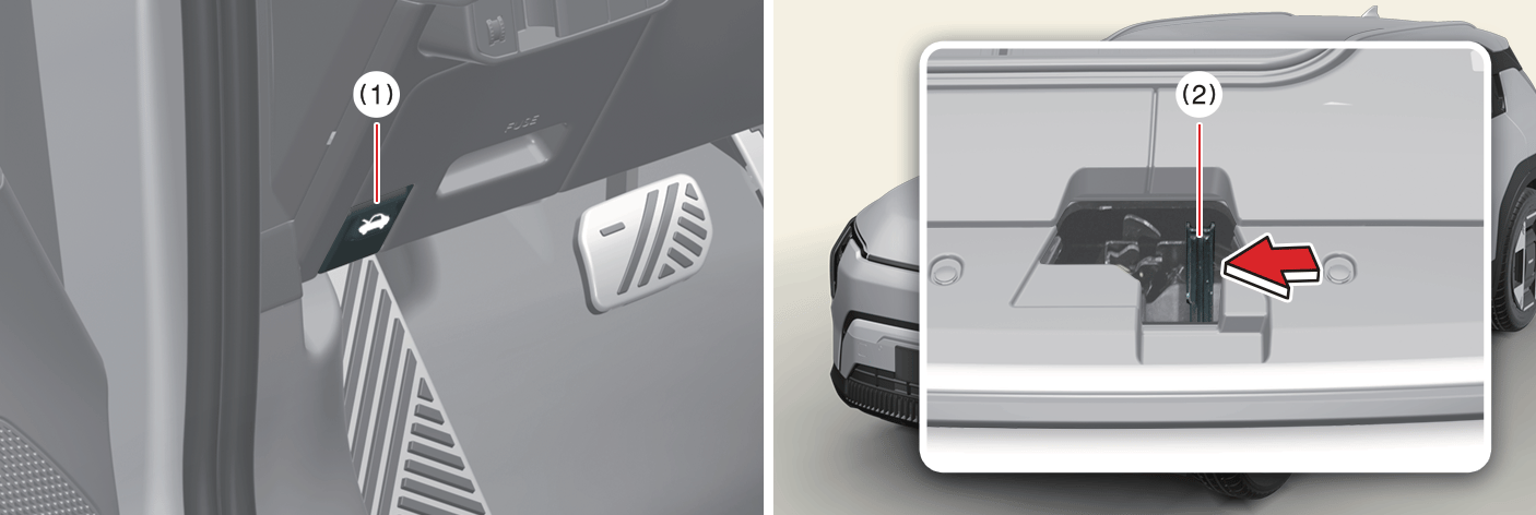 Schieben Sie den sekundären Haubenentriegelungshebel (2) nach links.