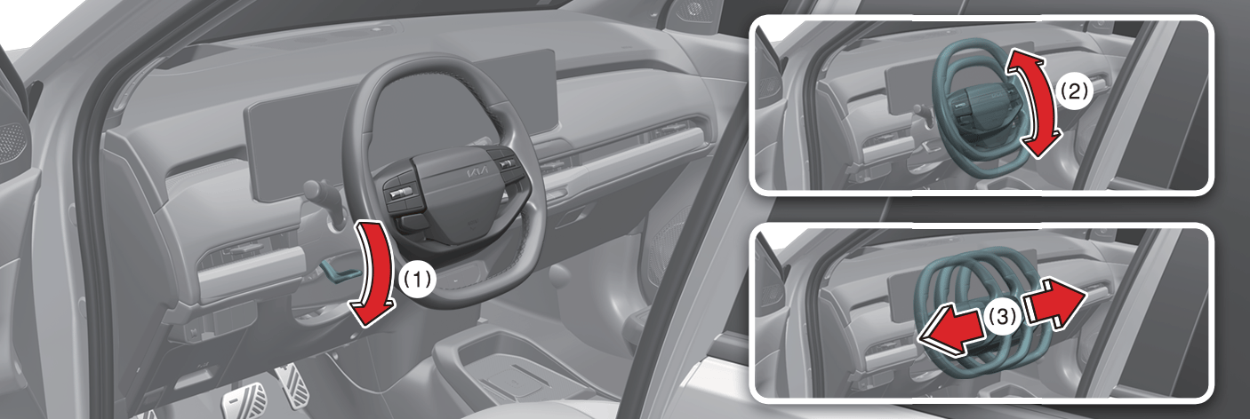 Bringen Sie das Lenkrad in den gewünschten Winkel (2) und vor/zurück in den gewünschten Abstand (3).