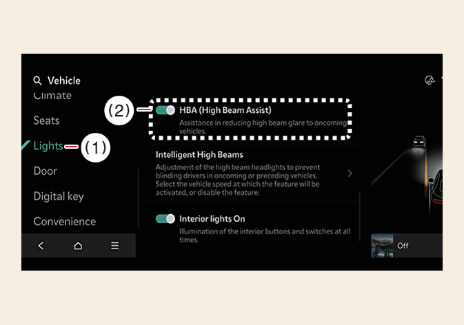 Wenn sich die EV-Taste in der Position EIN befindet, wählen Sie aus dem Menü Fahrzeugeinstellungen, um den Fernlichtassistenten einzuschalten, und deaktivieren Sie ihn, um die Funktion zu deaktivieren.