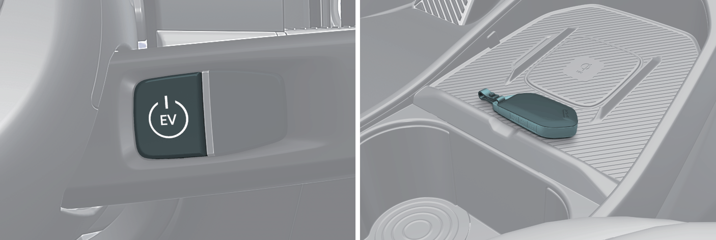 Drücken Sie im Modus OFF oder POWER ON die EV-Taste, während Sie das Bremspedal in P (Parken) betätigen.