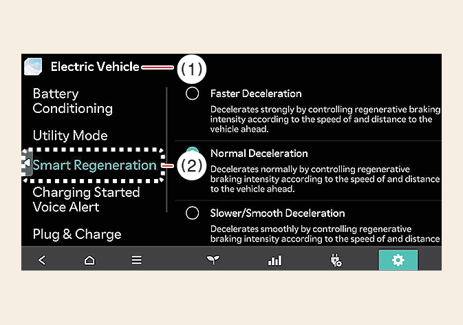 Die Abstandsstufe für das intelligente regenerative Bremsen erlaubt es, den Abstand zum vorausfahrenden Fahrzeug entsprechend der Abstandsstufe des Fahrers (Stufe 1 / Stufe 2 / Stufe 3) einzustellen.
