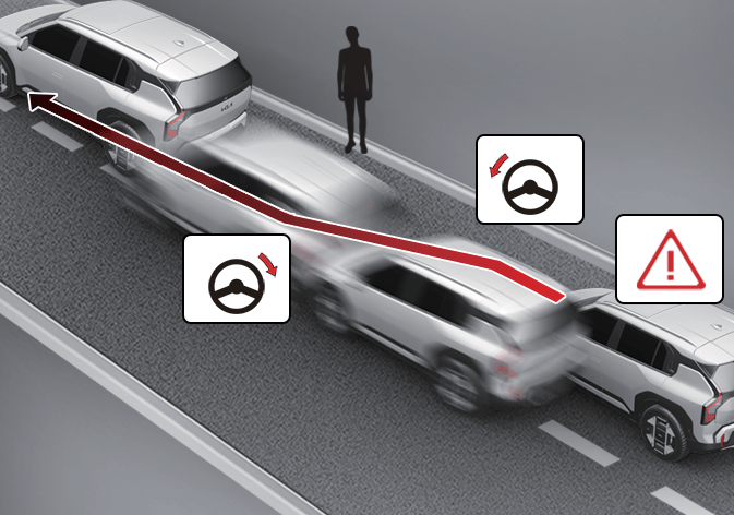 Die Seitliche Spurwechselassistenzfunktion trägt dazu bei, eine Kollision mit Fahrzeugen oder motorisierten Zweirädern auf der angrenzenden Fahrspur beim Fahrspurwechsel zu vermeiden, indem sie den Fahrer beim Lenken unterstützt. |