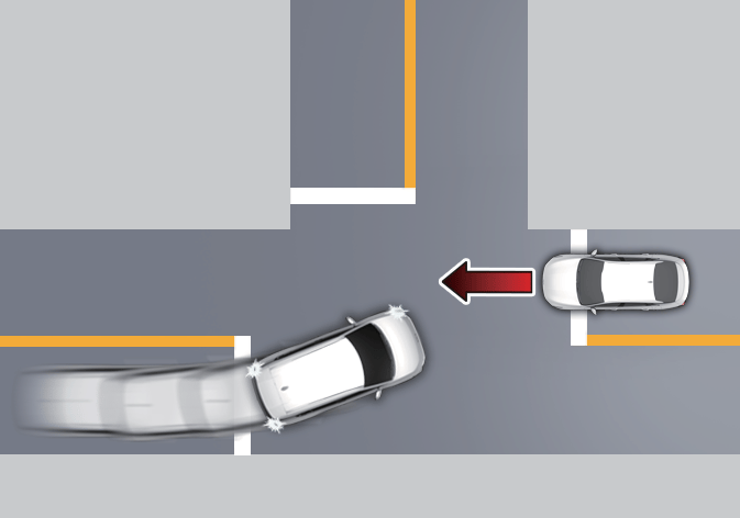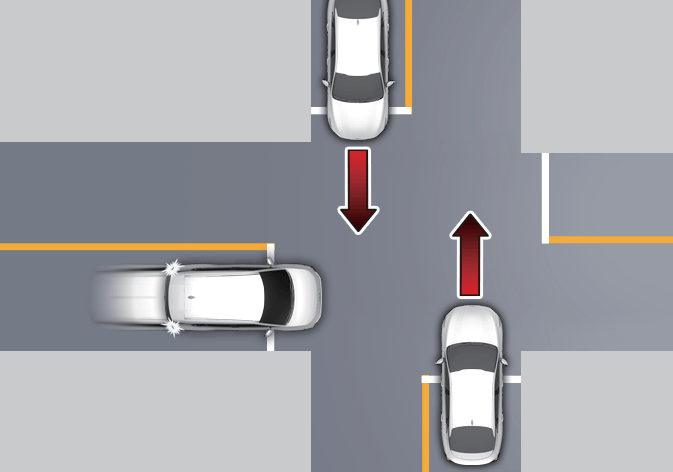 Die Funktion zur Kreuzungs-Kollisionsvermeidung verhindert beim Überqueren einer Kreuzung eine Kollision mit entgegenkommenden Fahrzeugen auf der linken oder rechten Seite durch eine Notbremsung. |