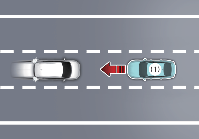 Die Funktion Direkter Gegenverkehr hilft dabei, die Geschwindigkeit bei einer Kollision zu reduzieren, wenn ein Fahrzeug oder motorisiertes Zweirad erkannt wird, das sich von der gegenüberliegenden Seite nähert. |