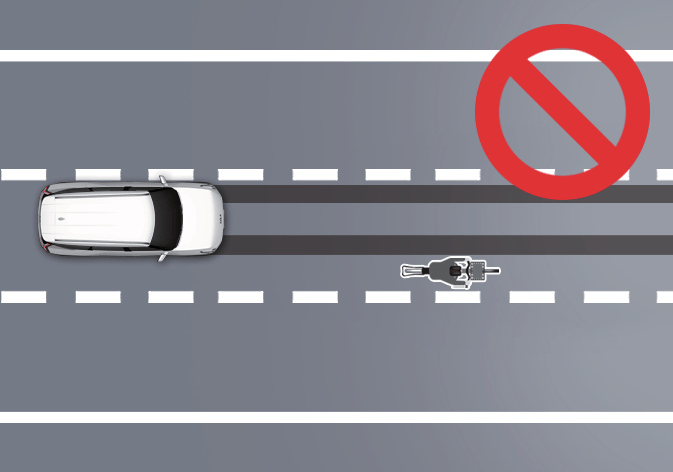 Die Fußgänger oder Radfahrer befinden sich innerhalb des Fahrbereichs, aber es ist nicht genügend Platz für ein Ausweichmanöver vorhanden. |
