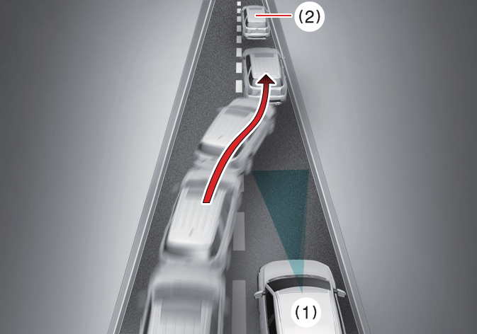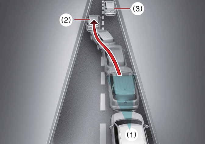 Wenn ein Fahrzeug oder motorisiertes Zweirad (2) von einer benachbarten Spur in Ihre Spur wechselt, kann es vom Sensor erst erkannt werden, wenn es sich im Erkennungsbereich des Sensors befindet. Der Frontalkollisions-Vermeidungsassistent erkennt ein Fahrzeug oder motorisiertes Zweirad (B) möglicherweise nicht sofort, wenn das Fahrzeug abrupt die Spur wechselt. In diesem Fall müssen Sie einen Sicherheitsabstand einhalten und ggf. das Bremspedal treten, um die Fahrgeschwindigkeit zu verringern und den Sicherheitsabstand zu halten. Wenn ein vor Ihnen fahrendes Fahrzeug (2) die Spur verlässt, erkennt der Frontalkollisions-Vermeidungsassistent das nun vor Ihnen fahrende Fahrzeug oder motorisierte Zweirad (3) möglicherweise nicht sofort. In diesem Fall müssen Sie einen Sicherheitsabstand einhalten und ggf. das Bremspedal treten, um die Fahrgeschwindigkeit zu verringern und den Sicherheitsabstand zu halten. |