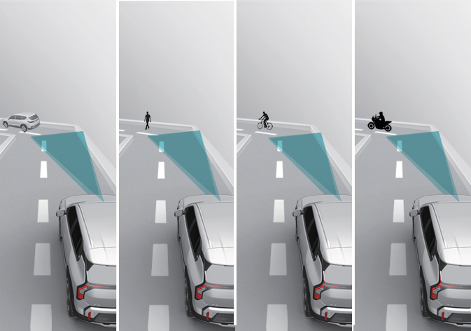 Weitere Einzelheiten zu den Einschränkungen bei der Erkennung von Fahrzeugen im hinteren seitlichen Bereich und Vorsichtsmaßnahmen in Bezug auf den hinteren Ecksensor finden Sie in Totwinkel-Kollisionsvermeidungsassistent (BCA).