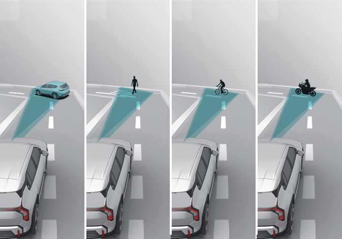 Der Frontalkollisions-Vermeidungsassistent kann aktiv werden, wenn er Objekte erkennt, die aufgrund der Form oder der Eigenschaften Fahrzeugen, motorisierten Zweirädern, Fußgängern und Radfahrern ähnlich sind.