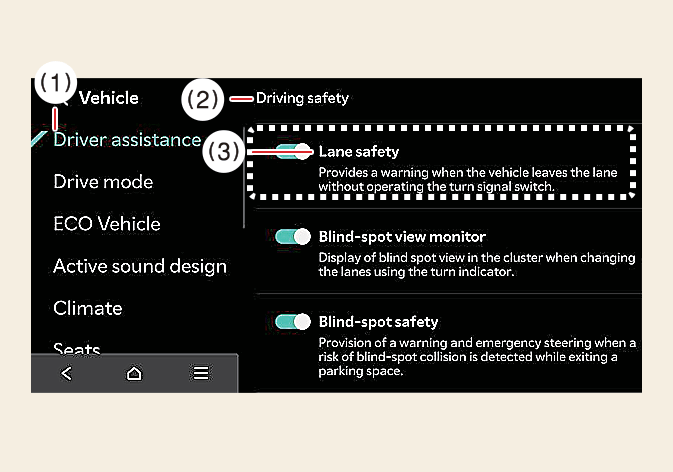 Spursicherheit: Wenn Spursicherheit ausgewählt ist, unterstützt der Spurhalteassistent automatisch die Lenkung des Fahrers, wenn er ein Verlassen der Fahrspur erkennt, um zu verhindern, dass das Fahrzeug von der Spur abkommt. Wenn Spursicherheit abgewählt wird, leuchtet die gelbe Kontrollleuchte (