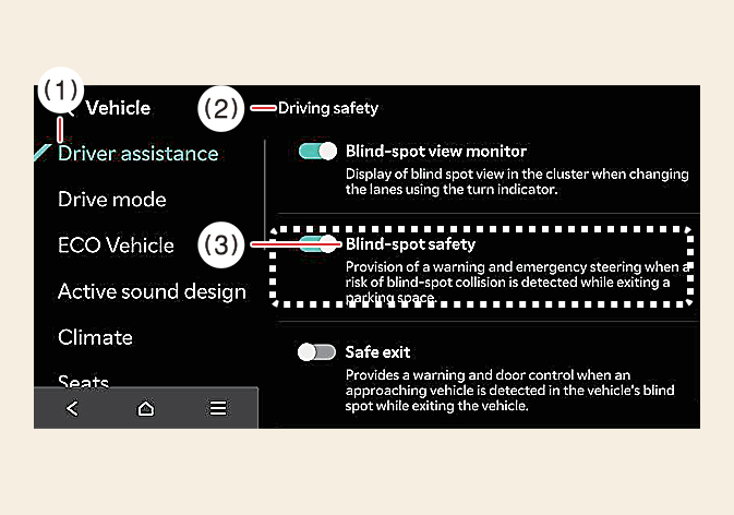 Wenn Totwinkelsicherheit abgewählt ist, kann der Fahrer keine Hilfe vom Totwinkel-Kollisionsvermeidungsassistenten erhalten. Fahren Sie stets umsichtig.
