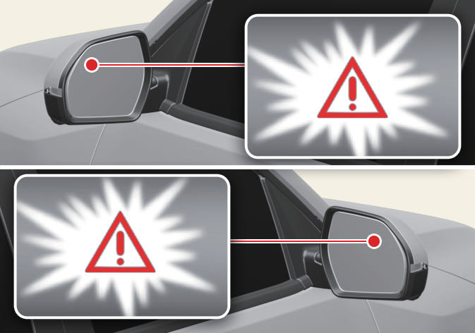 Die Kollisionswarnung warnt den Fahrer durch eine Warnleuchte im Kombiinstrument, im Außenspiegel und im Head-Up-Display (ausstattungsabhängig) sowie durch einen Warnton und Lenkradvibration.