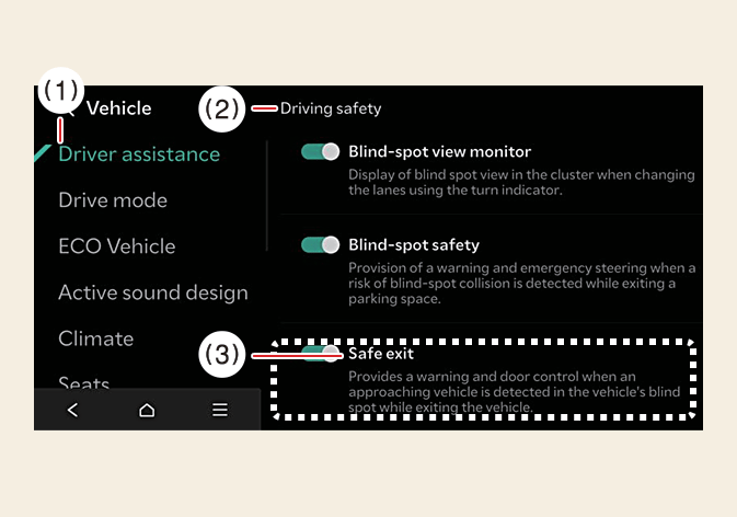 Wenn das Fahrzeug ausgeschaltet und wieder neu gestartet wird, behält der Ausstiegswarnung die letzte Einstellung bei.