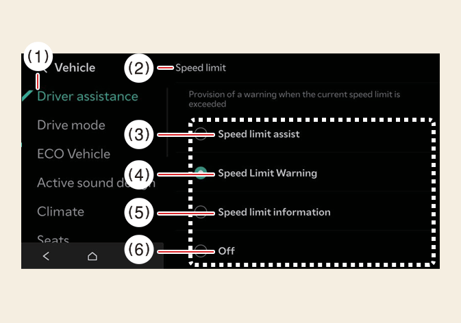 Wenn Sie das Fahrzeug ausschalten und neu starten, schaltet sich die Warnung vor Geschwindigkeitsbegrenzungen automatisch ein. Achten Sie darauf, dass Sie an einem sicheren Ort parken, bevor Sie den Intelligenten Geschwindigkeitsbegrenzungsassistenten einstellen.