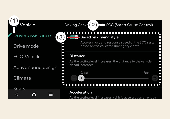Wenn bei Fahrzeug in DRIVE READYauf dem Bildschirm des Infotainment-Systems ausgewählt wird, berücksichtigt die intelligente Tempomatsteuerung den Fahrstil des Fahrers, wie den Abstand zum vorausfahrenden Fahrzeug, die Beschleunigung und die Reaktionsgeschwindigkeit.