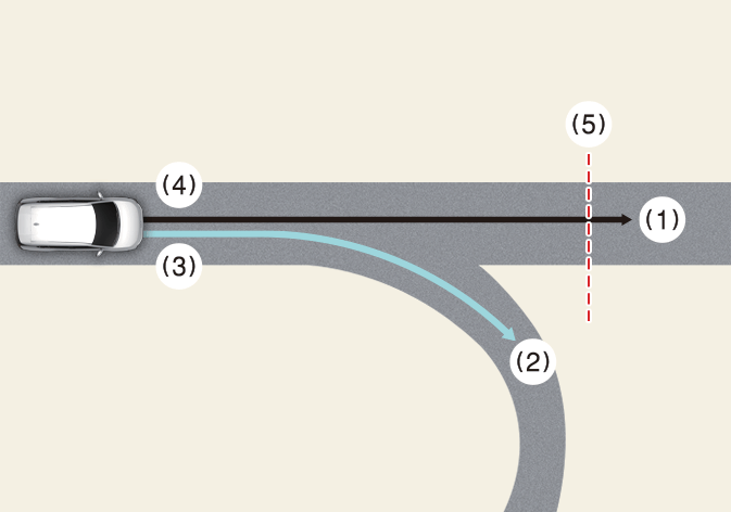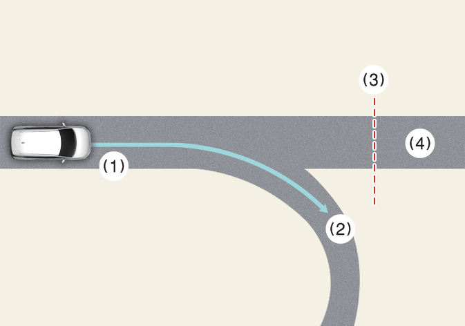 Wenn die navigationsbasierte intelligente Tempomatsteuerung aktiv ist, wenn Sie die Hauptfahrbahn verlassen, um in ein Autobahnkreuz, eine Anschlussstelle oder eine Rastanlage, usw. einzufahren, kann die Funktion noch einige Zeit in Betrieb sein.