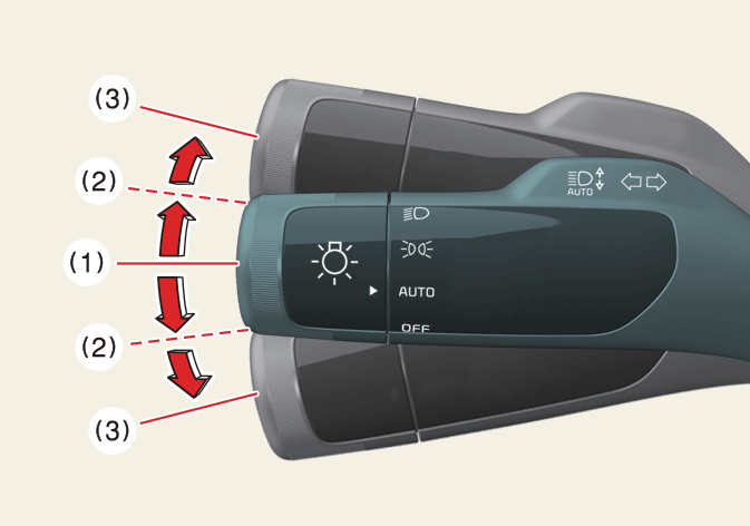 • Wenn der Blinkerhebel in die Position (3) gestellt wird, ist die Autobahn-Fahrspurwechselhilfe aktiv. Wenn der Blinkerhebel anschließend in die Neutralstellung gebracht wird, wird die Autobahn-Fahrspurwechselhilfe abgebrochen, bevor in die Spur gewechselt wird.