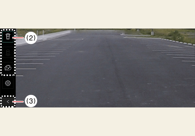 Drücken der Taste zum Umschalten der Ansicht (2) auf dem Umgebungsüberwachungs-Monitor, um die Ansicht von oben, von vorne, von der Seite oder die Weitsicht auszuwählen.