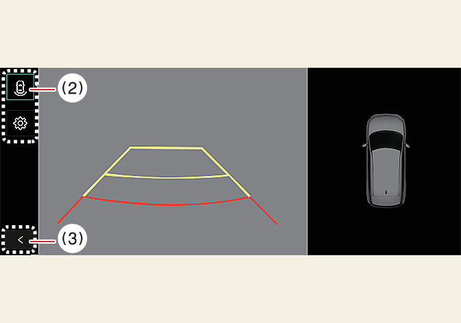 Wenn Sie die Taste zum Umschalten der Ansicht (2) auf dem Umgebungsüberwachungs-Monitor drücken, um die Hecksicht, Rückansicht von oben, Rückansicht nach der Seite oder Weitsicht hinten auszuwählen.
