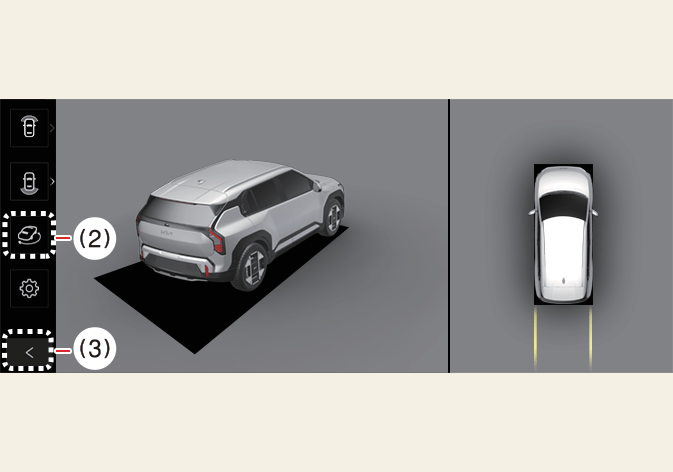 P (Parken) oder N (Neutral) oder D (Fahren) bei einer Fahrzeuggeschwindigkeit von unter 10 km/h (6 mph), oder wenn die Taste 3D-Ansicht (2) gewählt wird, während der Umgebungsüberwachungs-Monitor bei Stellung R (Rückwärts) aktiviert ist.