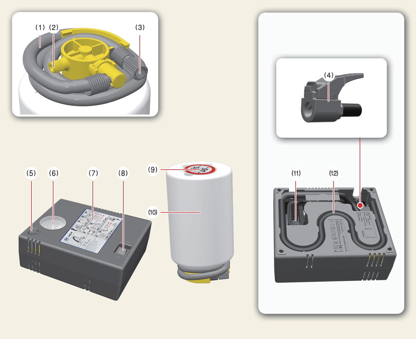 Verbinder, Kabel und Anschlussschlauch befinden sich im Kompressorgehäuse.