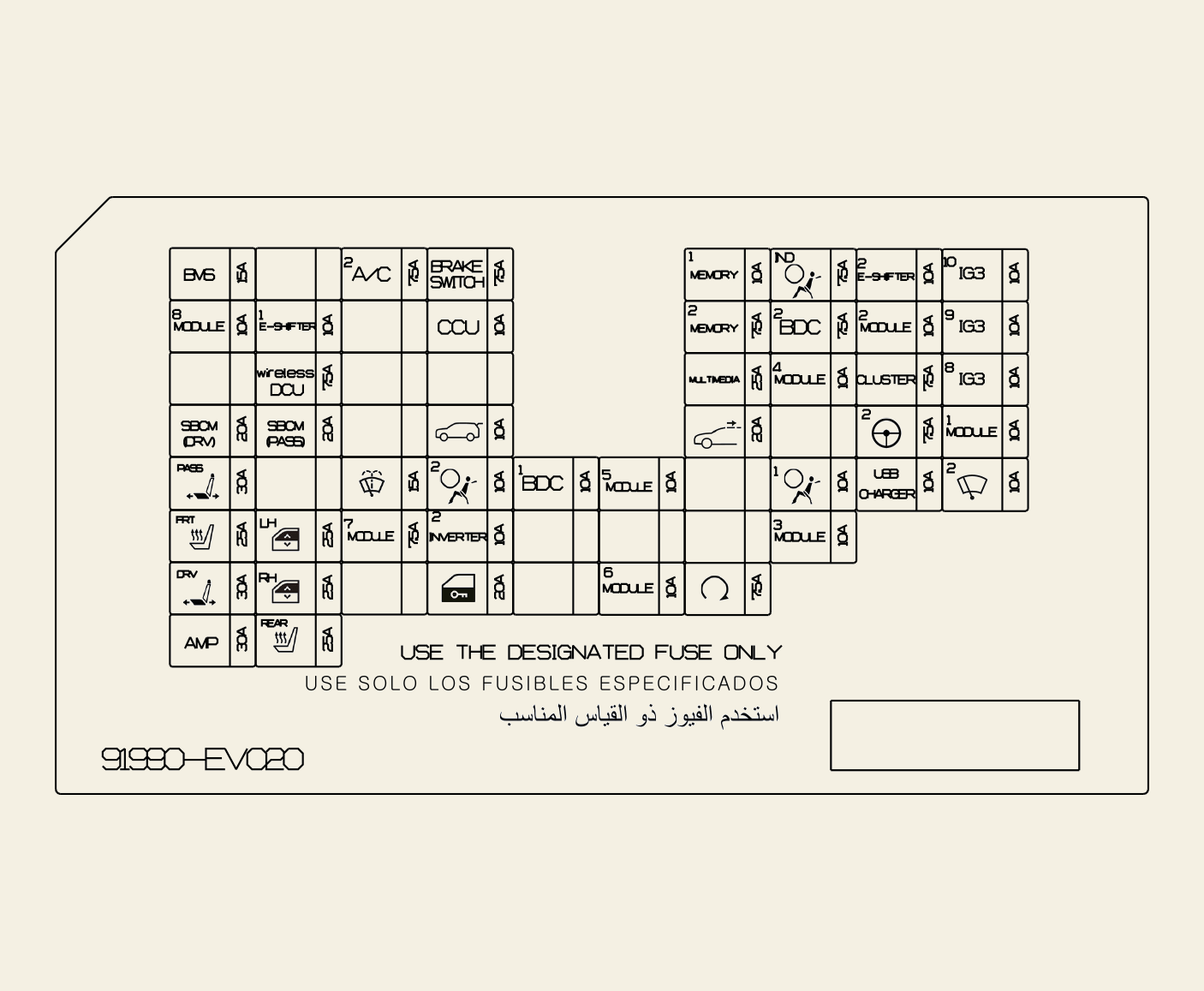 CCNC, PTC-Heizungssignal, CDU (Klima-Anzeige-Einheit), DATC (Dualer automatischer Temperaturregler), Active Incar, PM-Sensor, el. Fensterheberschalter RL&RR, V2L-Signal, TÜR-Schalter |