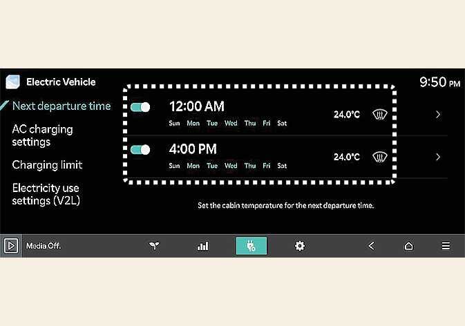 Select the day of the week to activate scheduled charging and target temperature for departure time.