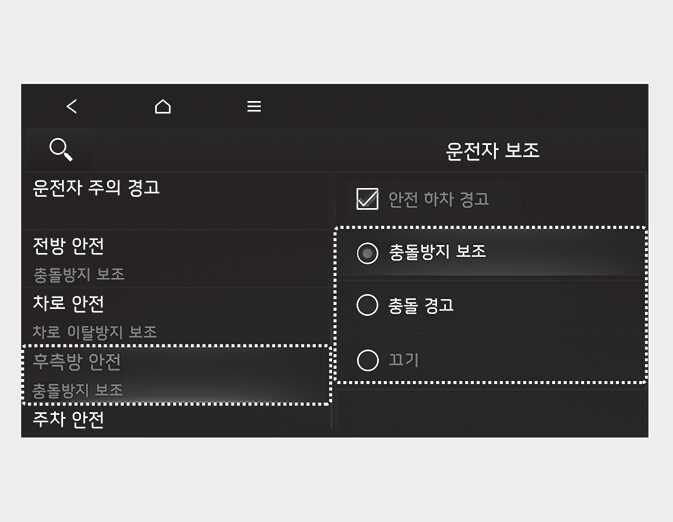 시동 'ON' 상태에서 인포테인먼트 시스템의 설정 → 차량 → 운전자 보조 → 후측방 안전을 차례로 선택하십시오. 각 기능의 사용 여부를 설정할 수 있습니다.