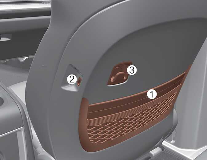 There is a double pocket (1) in the front seat back for storing simple books or atlases, USB charger (2), and the hook (3) (if equipped) for rear passengers.