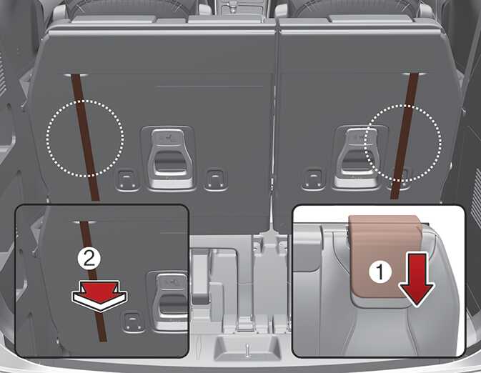 Lower the headrest to the lowest position (1). To stow easily, adjust the seatback (2) to upright position. (if necessary)